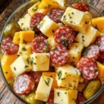 A simple and delicious marinated cheese appetizer combining cheese cubes, salami, and pickles in a flavorful vinaigrette. Perfect for entertaining or as a quick appetizer.
