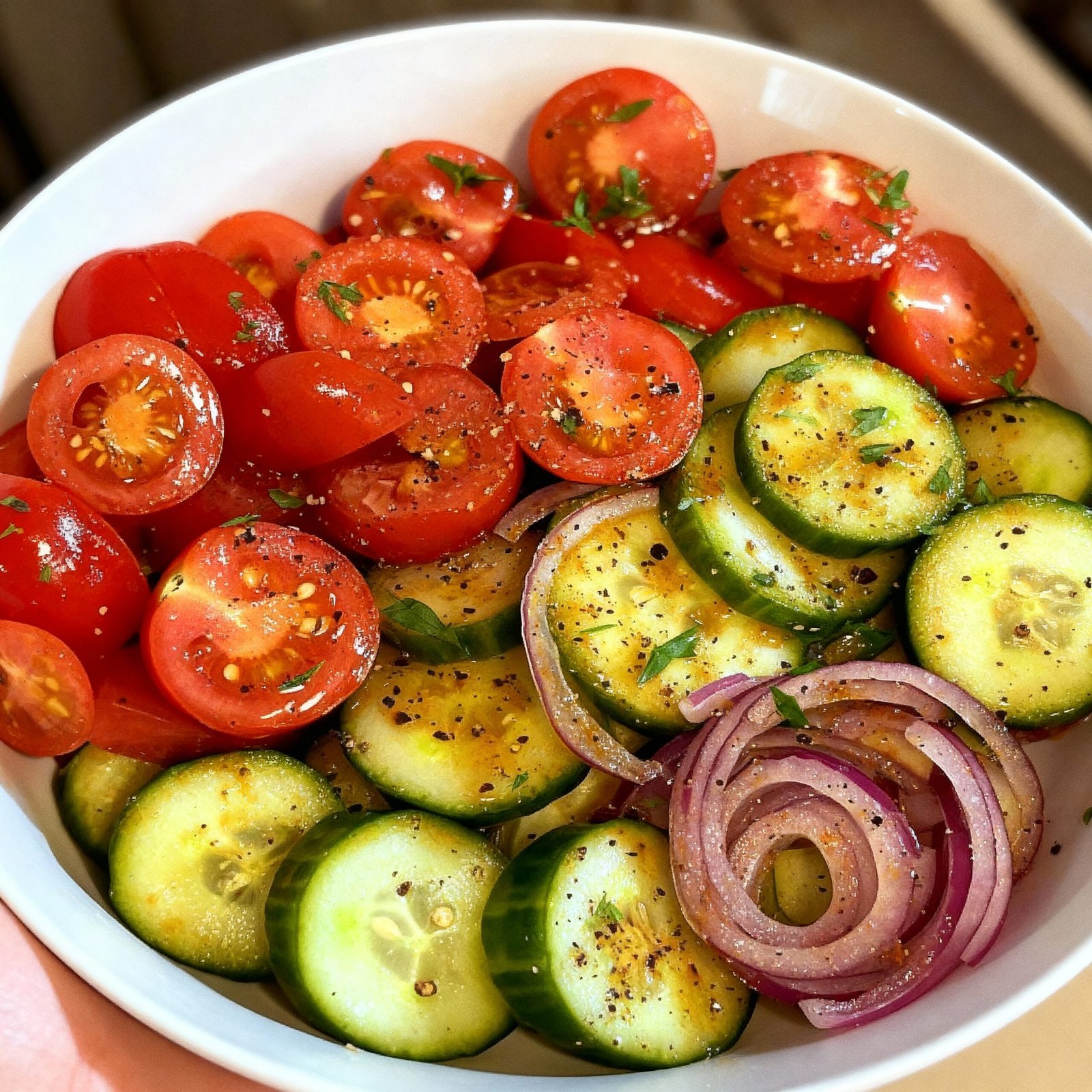 A refreshing marinated salad combining fresh cucumbers, onions, and tomatoes in a tangy vinegar-based dressing.