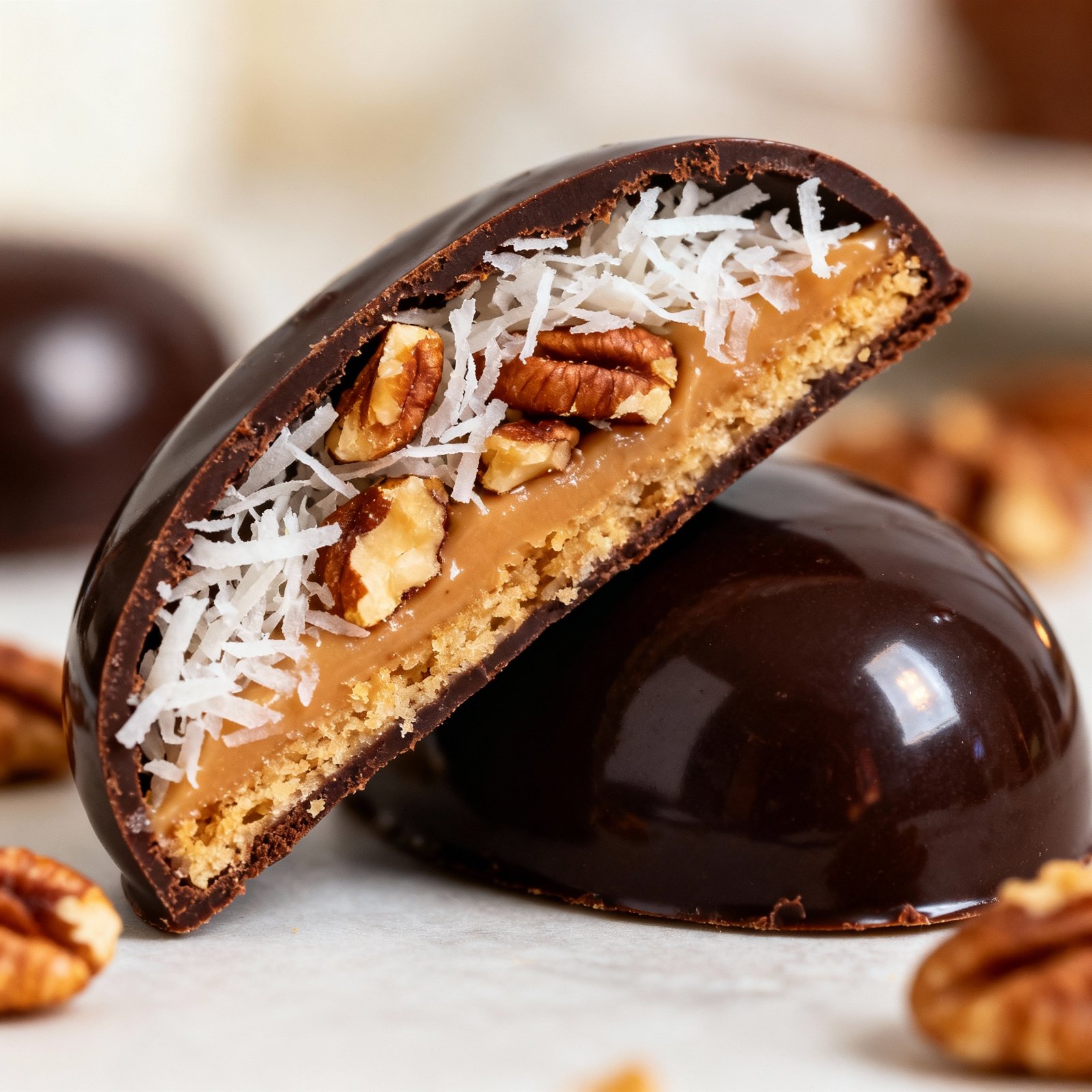 - Mistake: Skipping the chilling step before dipping. Fix: Chill the coconut-pecan centers thoroughly so they hold their shape and don’t crumble when coated in chocolate.