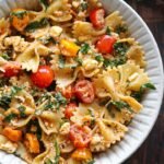 1. Cook 10 oz farfalle pasta in boiling salted water until al dente; drain and set aside.