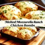Remove the baking dish from the oven and let the Melted Mozzarella Ranch Chicken Bombs rest for 5 minutes. This allows the juices to redistribute and makes the chicken easier to slice without losing the cheesy filling.