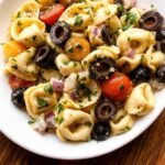 A flavorful pasta salad featuring cheese-filled tortellini mixed with olives, fresh vegetables, and a zesty dressing, perfect for a hearty meal or side dish.