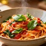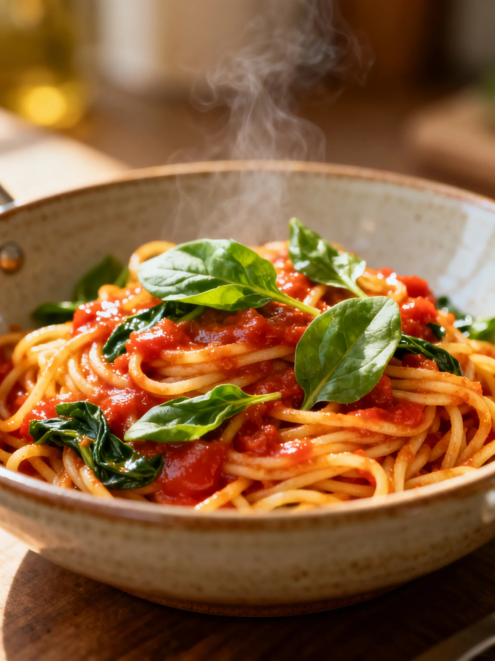 Context: This One-Pot Tomato Spinach Pasta is roughly 25% faster than traditional stove-top pasta dishes that require separate pots and extra washing. Perfect for busy weeknights, you can have dinner on the table in half an hour, with only one pot to clean afterward. Unlike boiling noodles in plain water, this method lets the pasta absorb the seasoned broth and diced tomatoes, making every bite more flavorful.