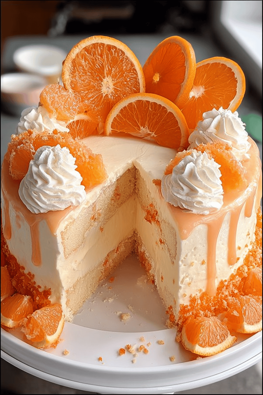For the best experience, slice frozen cake with a warm knife for clean, beautiful servings that capture that classic creamsicle flavor.