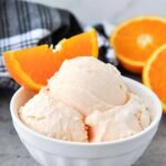 Press a piece of parchment paper directly onto the surface, cover the pan tightly, and freeze for at least 4–6 hours to allow the orange creamsicle ice cream to firm up or “ripen.” For the best scoopable texture, let it sit at room temperature for 5–10 minutes before serving.