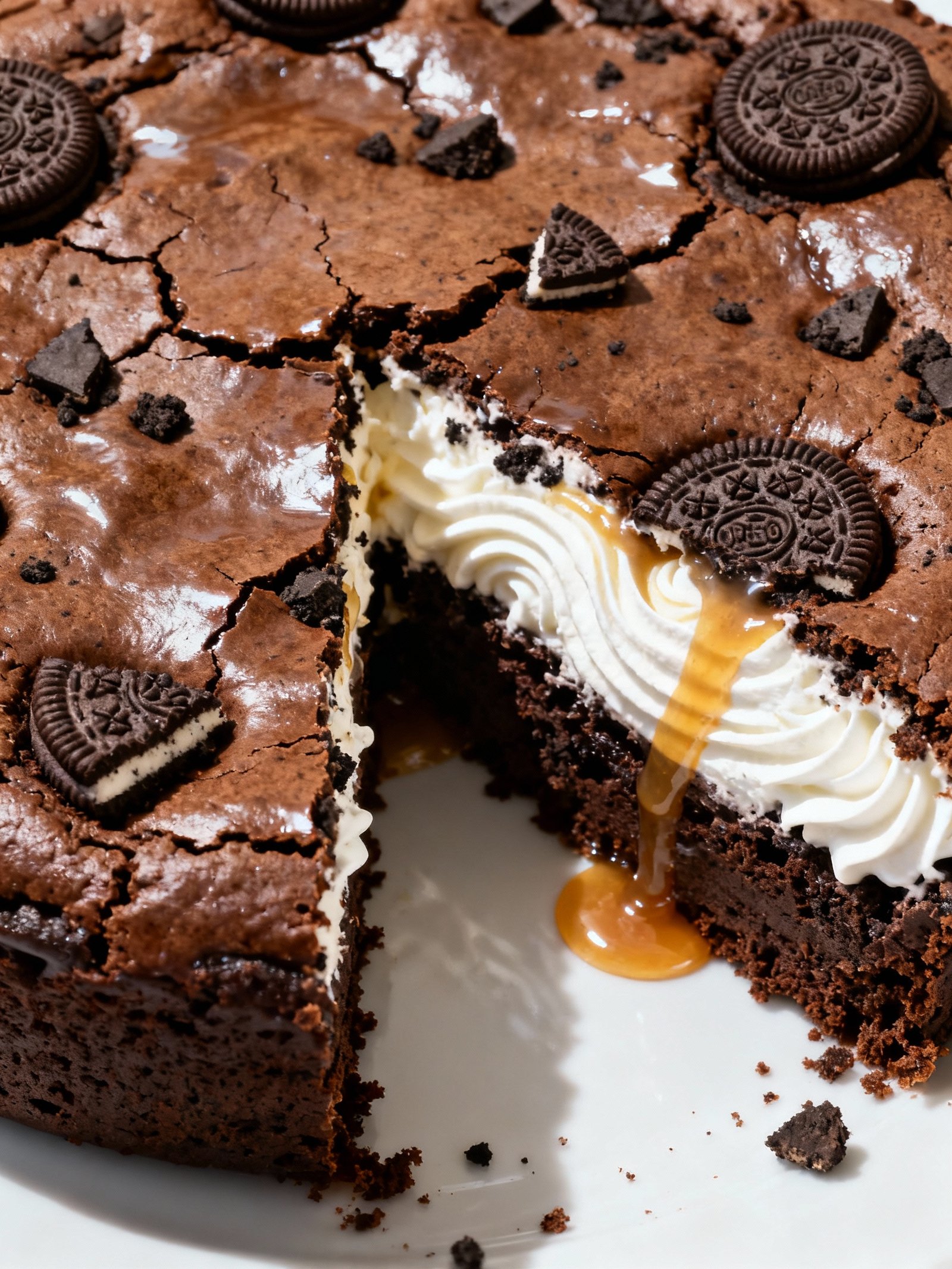 A rich, chocolatey brownie cake infused with crushed Oreo cookies for added crunch and flavor—perfect for chocolate lovers and Oreo fans alike.