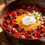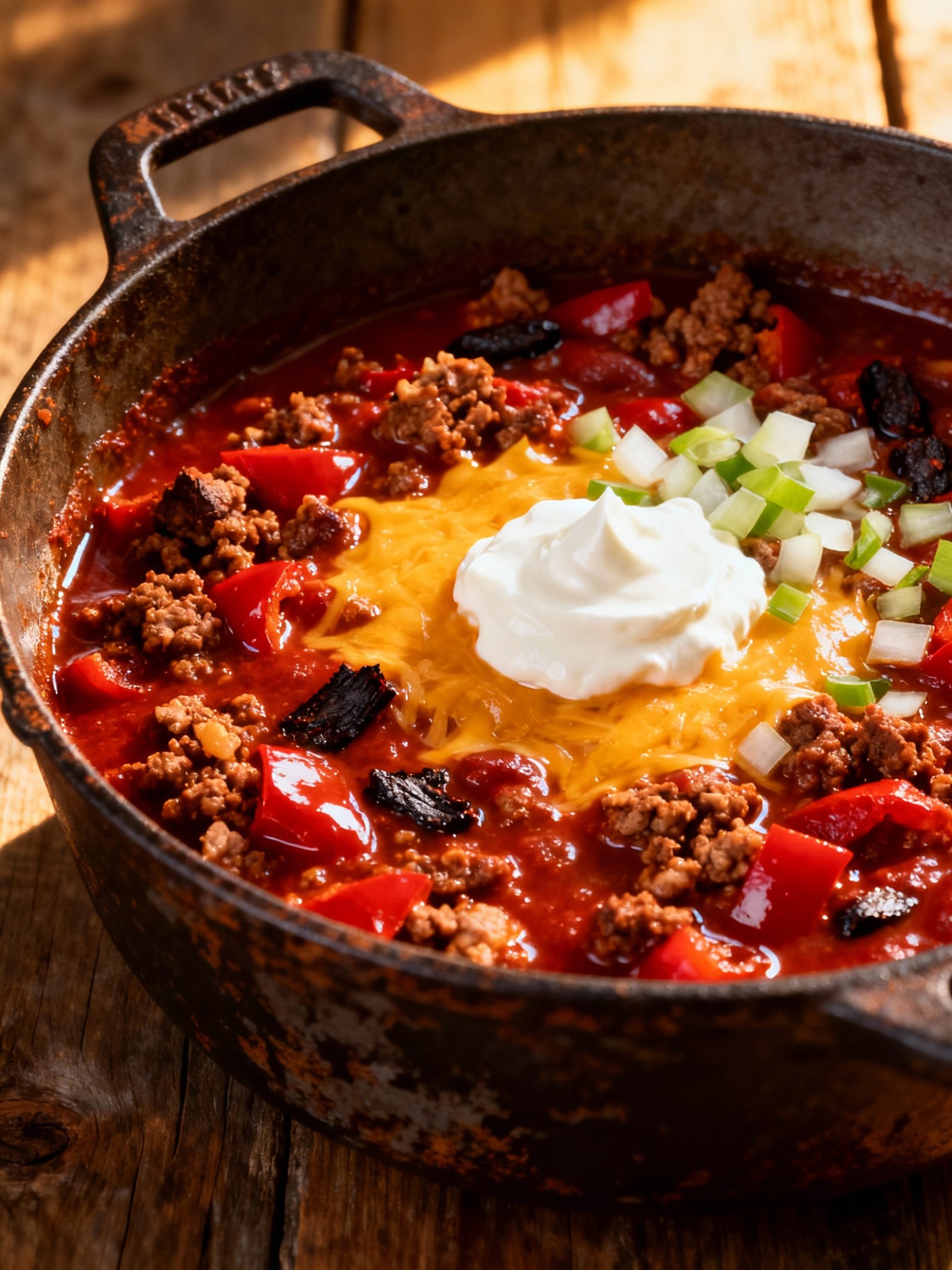 Ladle the chili into bowls and top with shredded cheese, sour cream, and chopped green onions. Serve immediately while hot for the ultimate comfort food experience.