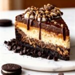 A silky, peanut buttery cheesecake with an Oreo cookie crust and a rich chocolate ganache topping.