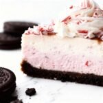 A festive peppermint cheesecake with a creamy peppermint filling, an Oreo cookie crust, and crushed candy cane pieces, perfect for the holiday season.