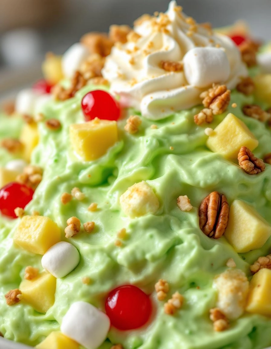A classic, creamy pistachio-flavored salad with marshmallows and pineapple, perfect for potlucks and holiday gatherings.