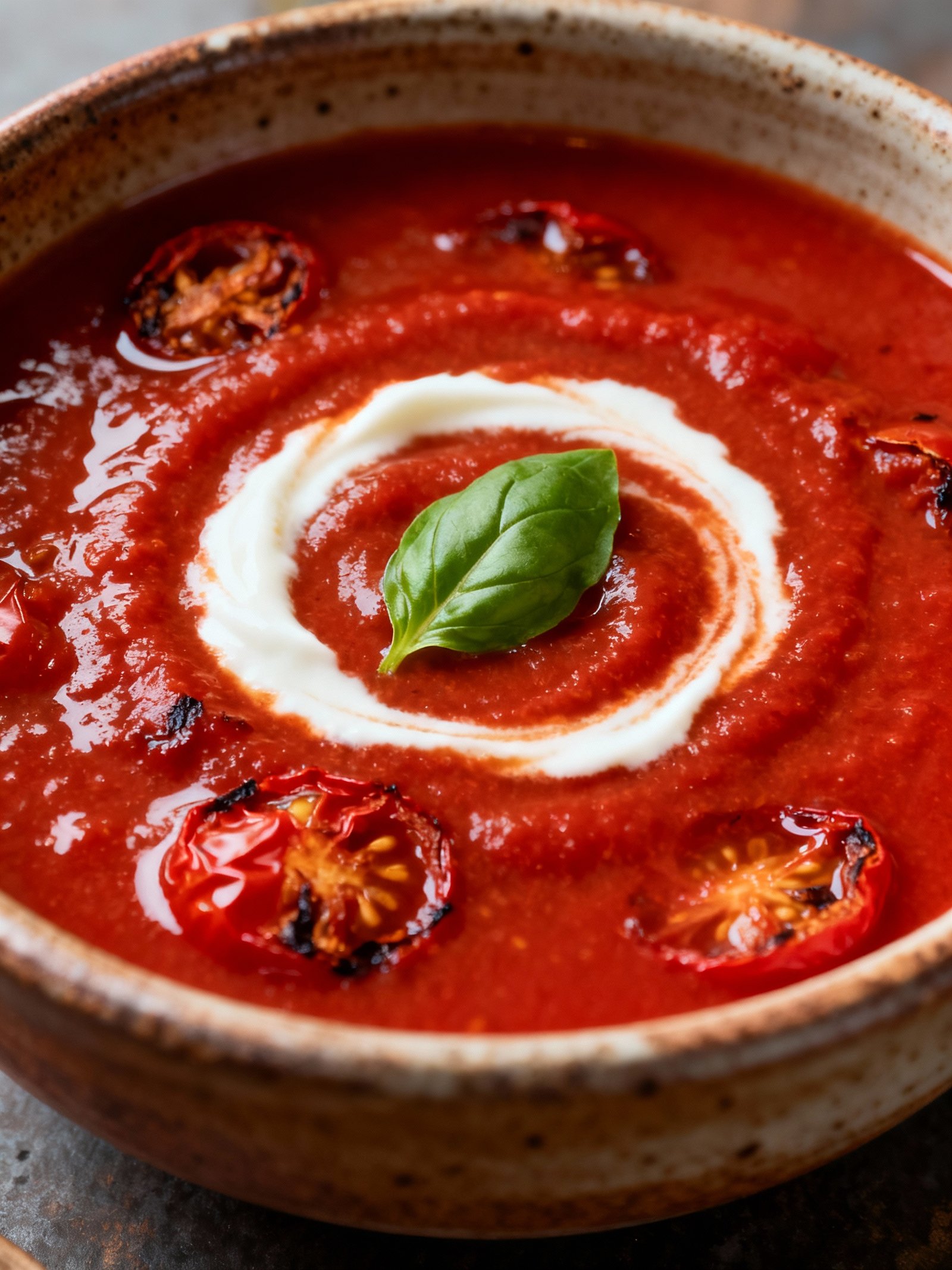 A rich and creamy roasted tomato soup with fresh basil, perfect for a comforting meal.