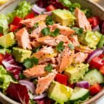 A fresh and delicious main dish salad featuring chopped vegetables, flaky cooked salmon, creamy avocado, and a tangy citrus dressing, perfect for a wholesome and protein-packed meal.