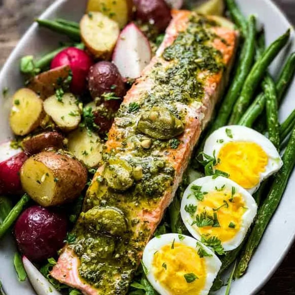 Once the salmon is done, place each warm, pesto-crusted fillet atop the dressed salad. Finish with a final drizzle of the remaining dressing and a generous grind of fresh black pepper. Serve immediately for a warm-and-cool contrast that makes this Salmon Nicoise Salad truly special.