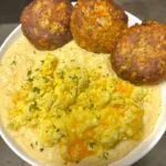 A classic Southern comfort meal featuring crispy salmon patties (croquettes), creamy cheesy grits, and cheesy scrambled eggs. Quick, budget-friendly, and perfect for breakfast or any meal.