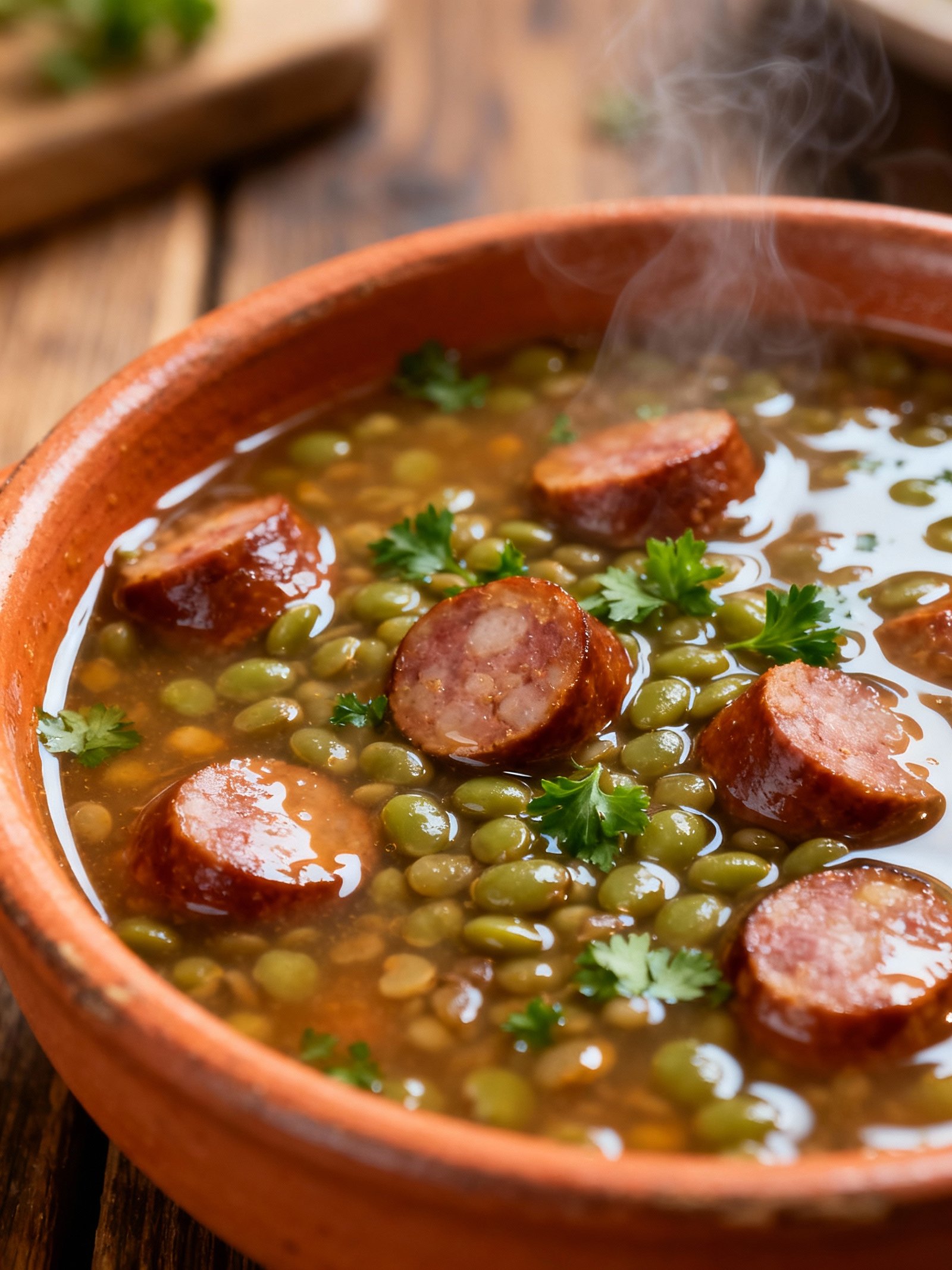 A hearty and flavorful soup featuring lentils, kielbasa sausage, vegetables, and spices simmered in chicken stock with a touch of red wine vinegar and Parmesan cheese.