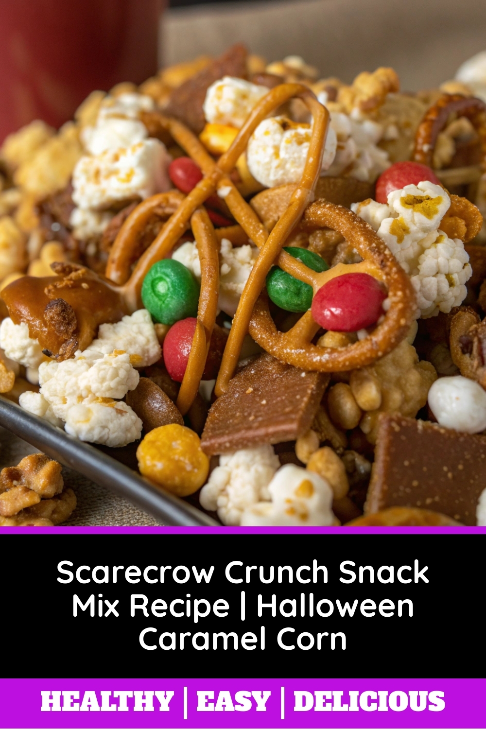 You can customize your mix with various salty and sweet ingredients. Popular additions for a snack mix like this include pretzels, nuts, cereal, and candy. The Scarecrow Crunch Snack Mix Recipe | Halloween Caramel Corn often includes festive candies and salty nuts for a perfect sweet and salty balance.