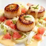 A refined dish featuring perfectly seared scallops served with sautéed fennel and grapefruit, finished with a rich beurre blanc sauce.
