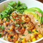 This vibrant bowl combines juicy grilled shrimp with creamy avocado and sweet mango over a bed of fluffy rice and crisp greens, all drizzled with a zesty lime-chili sauce.