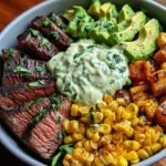This steak avocado and roasted corn bowl is a vibrant, satisfying meal that comes together quickly. Featuring juicy steak, creamy avocado, and sweet roasted corn, it’s all brought together with a zesty cilantro cream sauce. For another hearty steak breakfast, try the Steak, Cheesy Eggs and Fried Potatoes Recipe. This recipe is perfect for a flavorful weeknight dinner or a meal-prep lunch.