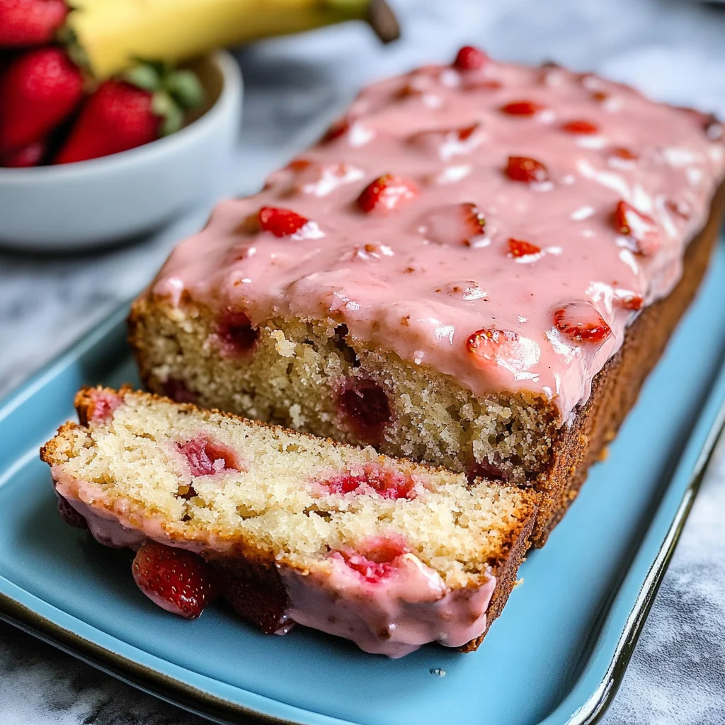 This moist and tender quick bread combines the sweet, mellow flavor of banana with juicy bursts of fresh strawberry, all topped with a luscious pink glaze.