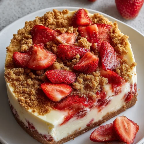 This easy no-bake strawberry crumble cheesecake is a dream come true for dessert lovers. With just five simple ingredients, it delivers a perfect balance of creamy, fruity, and crunchy textures without ever turning on the oven. It’s an ideal make-ahead treat for any occasion. For another delightful strawberry dessert, try this Strawberry Crunch Salad Recipe.