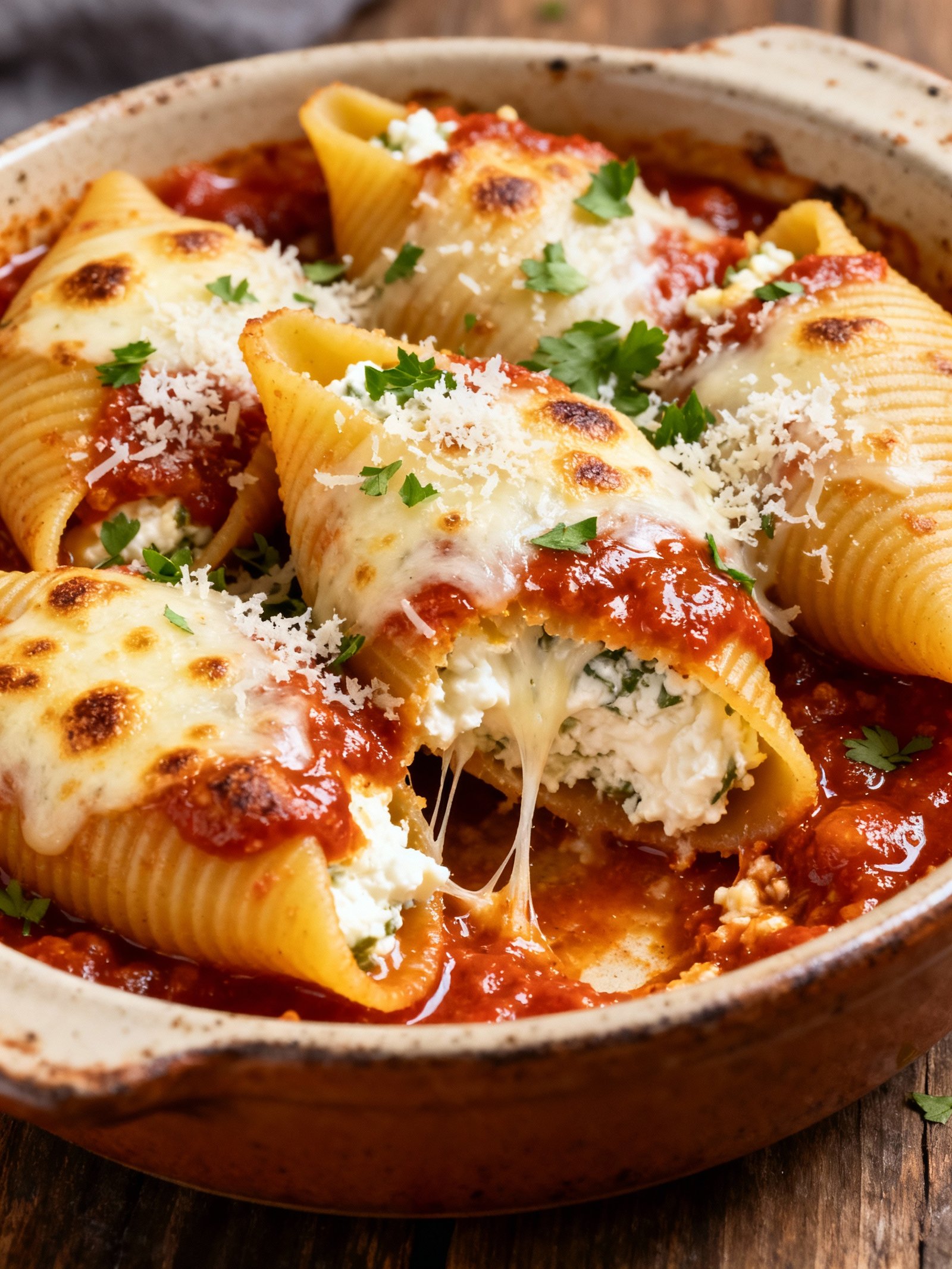A classic, comforting dish featuring jumbo pasta shells stuffed with a rich blend of three cheeses, baked in a savory tomato sauce. Perfect for a hearty vegetarian meal.