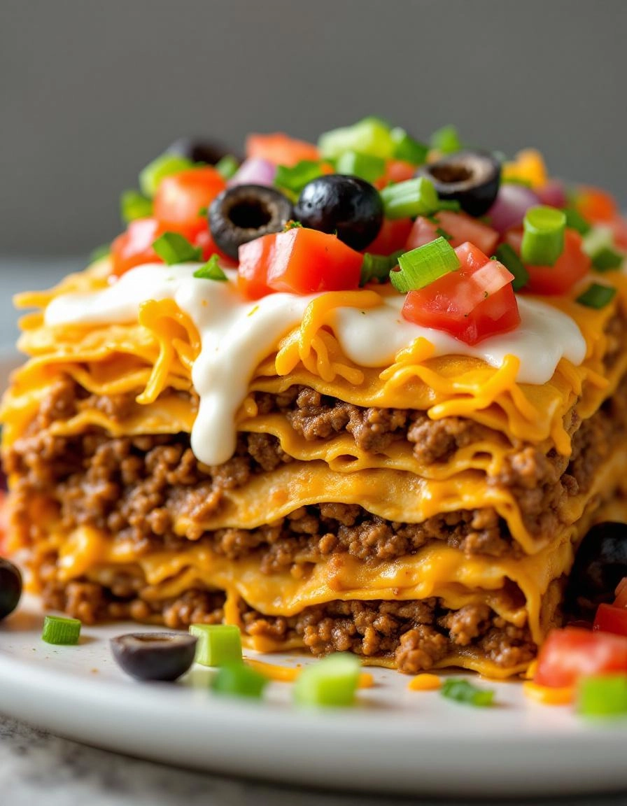 A delicious fusion of tacos and lasagna, layered with seasoned ground beef, cheese, and tortillas.