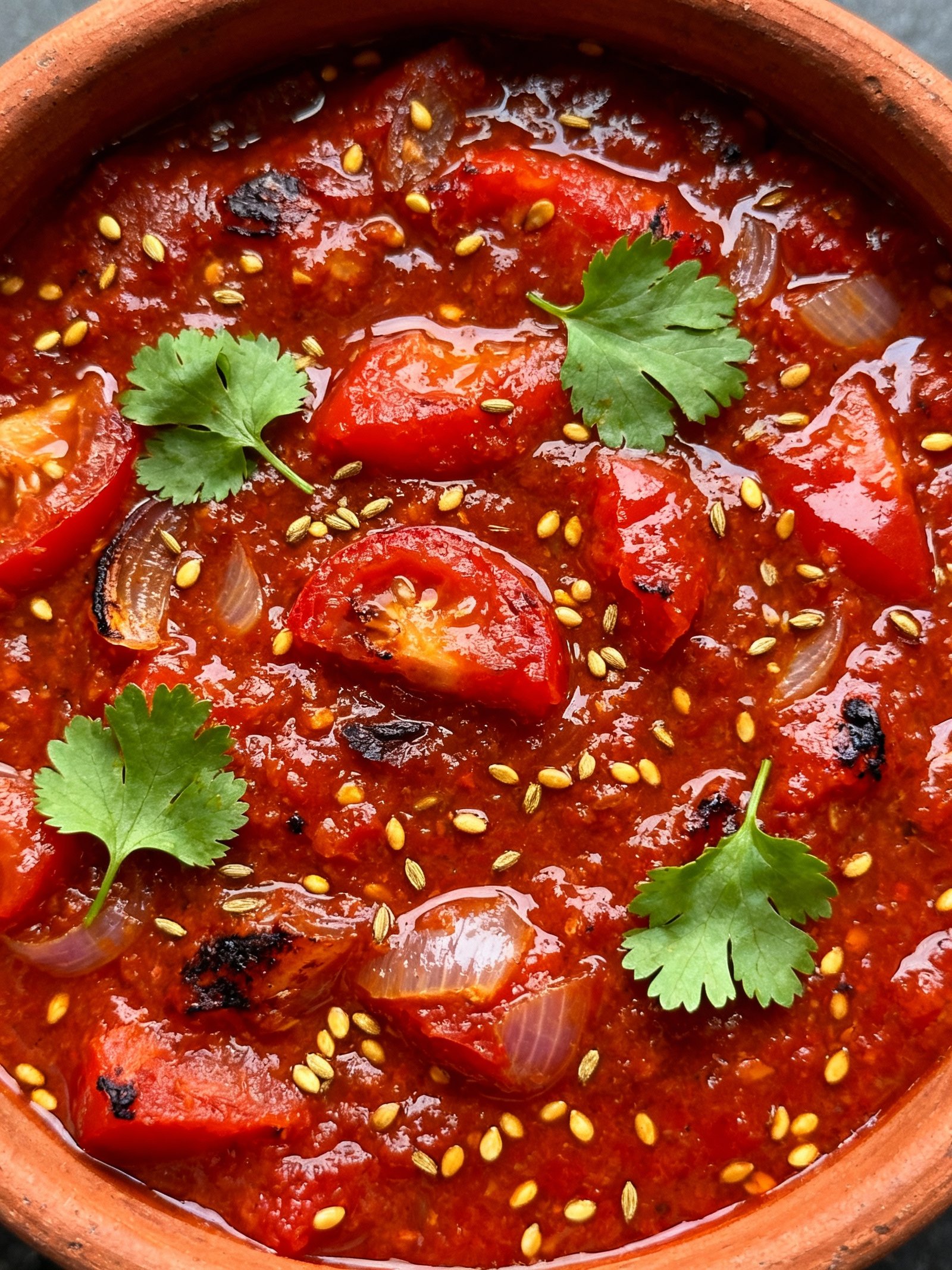 A flavorful roasted tomato chutney made with garlic and spices, perfect as a condiment or dip.