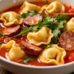 This hearty tortellini soup combines savory Italian sausage, tender cheese-filled pasta, and peppery arugula in a rich, herb-infused broth that’s both comforting and deeply flavorful.