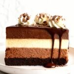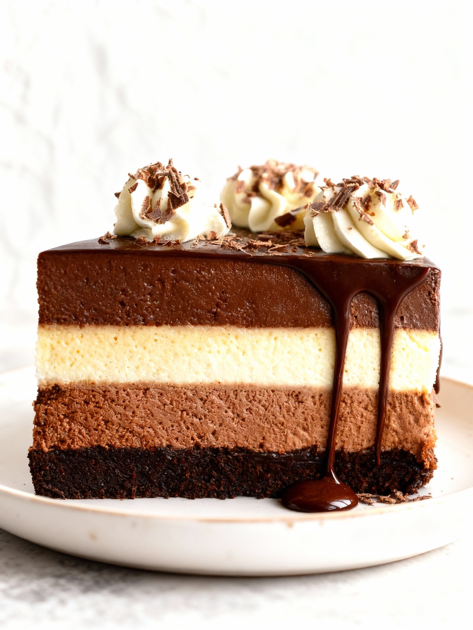 A rich and decadent triple chocolate mousse cake featuring layers of dark, milk, and white chocolate mousse on a chocolate cake base, perfect for chocolate lovers.