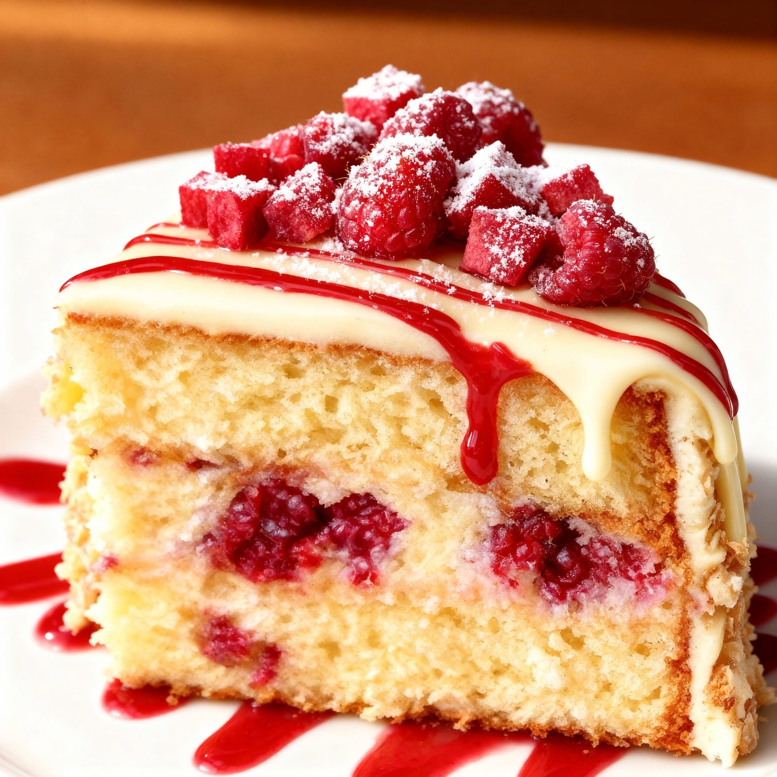 A rich and decadent layered cake combining moist white chocolate cake with fresh raspberries and creamy white chocolate frosting, delivering a dreamy dessert experience.