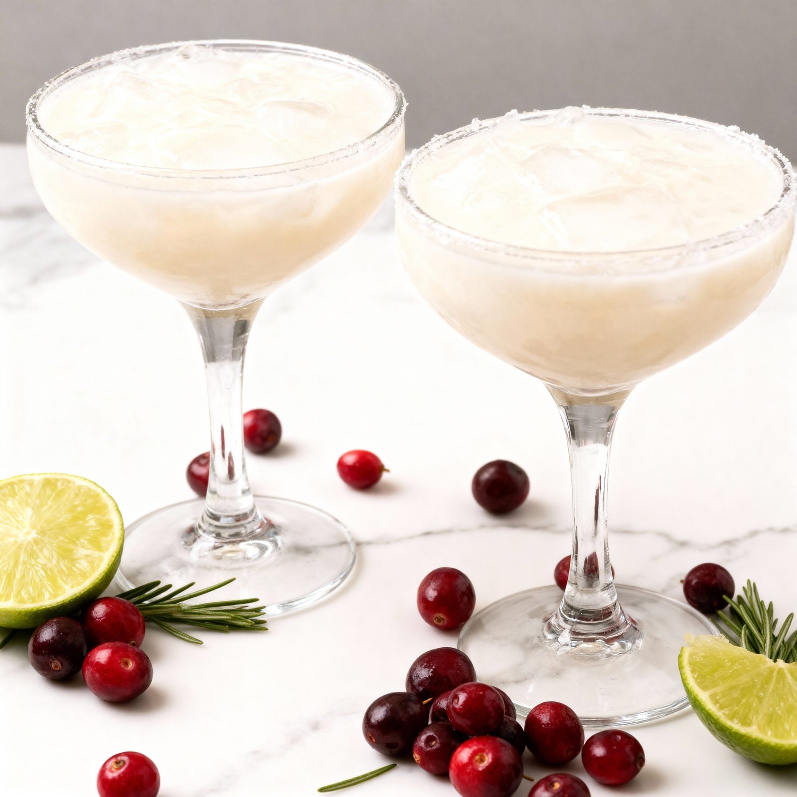 A creamy and festive margarita featuring coconut milk, tequila, Cointreau, and fresh lime juice, garnished with cranberries, lime wedges, and rosemary sprigs. Perfect for holiday celebrations.